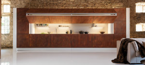 Prezentowana kuchnia znajduje się w przestrzeni pokoju dziennego. Została ona ukryta w zabudowie mającej prawie 7m długości. W momencie, gdy mieszkańcy nie korzystają z niej jest ona jedynie szafą idealnie wkomponowaną w cały wystrój. System w który została wyposażona umożliwia otwarcie całego założenia uruchamiając tym samym dodatkowe oświetlenie i dodatkowym pochłaniaczem. Blat po odsłonięciu jest gotowy do pracy, a pojedyncze szafki umożliwiają segregację małych podręcznych kuchennych przedmiotów. Stylowa powierzchnia rdzawego koloru nadaje ciekawego wyglądu całości – podczas pracy, jak i po zamknięciu.