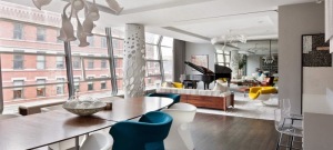 Mieszkanie w stylu loftu zlokalizowane niedaleko Soho w NY. Biel, szarość w połączeniu z drewnem nadaje harmonii całej przestrzeni. Użyte kolory – niebieski, żółty i czerwony dzielą na strefy całe mieszkanie.